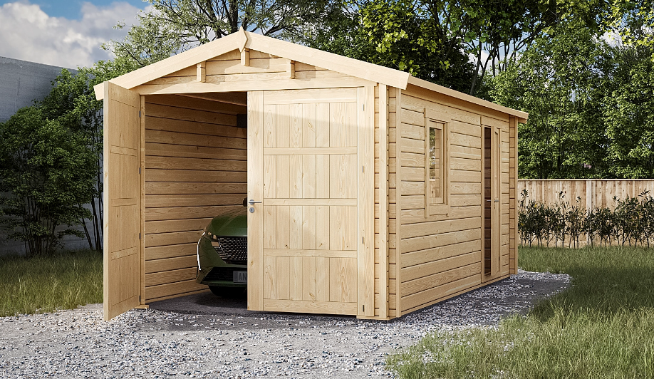 - Garage en bois 15–18 m² : idéal pour une voiture compacte ou un espace atelier.